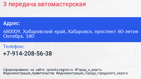 3 передача, автомастерская по адресу 680009, Хабаровский край, Хабаровск, проспект 60-летия Октября, 180 в дальнейшем Организация, размещена в следующих категориях: