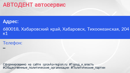АВТОДЕНТ, автосервис по адресу 680018, Хабаровский край, Хабаровск, Тихоокеанская, 204 к1 в дальнейшем Организация, размещена в следующих категориях: