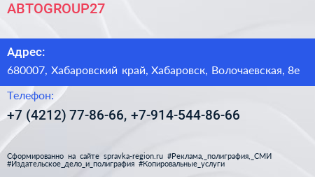 АВТОGROUP27 по адресу 680007, Хабаровский край, Хабаровск, Волочаевская, 8е в дальнейшем Организация, размещена в следующих категориях: