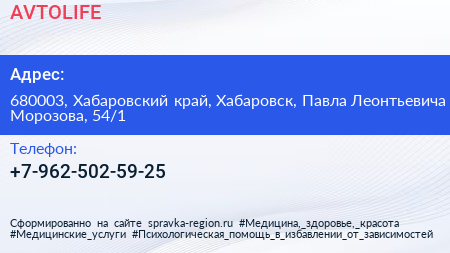 AVTOLIFE по адресу 680003, Хабаровский край, Хабаровск, Павла Леонтьевича Морозова, 54/1 в дальнейшем Организация, размещена в следующих категориях: