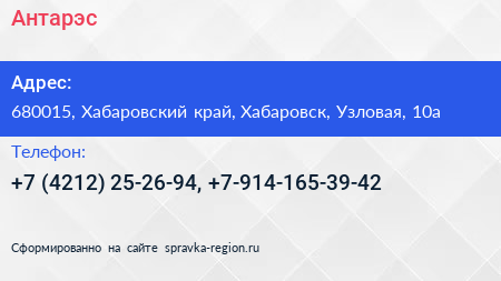 Антарэс по адресу 680015, Хабаровский край, Хабаровск, Узловая, 10а в дальнейшем Организация, размещена в следующих категориях: