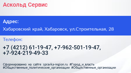 Аскольд-Сервис по адресу Хабаровский край, Хабаровск, ул.Строительная, 28 в дальнейшем Организация, размещена в следующих категориях: