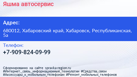 Яшма, автосервис по адресу 680012, Хабаровский край, Хабаровск, Республиканская, 5а в дальнейшем Организация, размещена в следующих категориях: