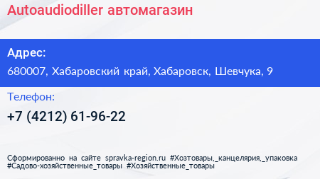 Autoaudiodiller, автомагазин по адресу 680007, Хабаровский край, Хабаровск, Шевчука, 9 в дальнейшем Организация, размещена в следующих категориях: