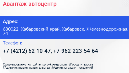 Авантаж, автоцентр по адресу 680022, Хабаровский край, Хабаровск, Железнодорожная, 74 в дальнейшем Организация, размещена в следующих категориях: