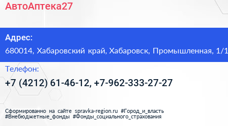 АвтоАптека27 по адресу 680014, Хабаровский край, Хабаровск, Промышленная, 1/1 в дальнейшем Организация, размещена в следующих категориях: