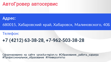 АвтоГровер, автосервис по адресу 680015, Хабаровский край, Хабаровск, Малиновского, 40Б в дальнейшем Организация, размещена в следующих категориях: