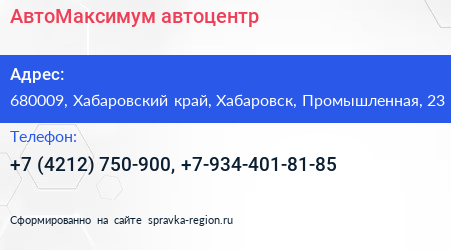 АвтоМаксимум, автоцентр по адресу 680009, Хабаровский край, Хабаровск, Промышленная, 23 в дальнейшем Организация, размещена в следующих категориях: