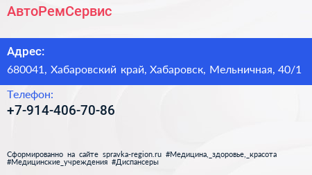 АвтоРемСервис по адресу 680041, Хабаровский край, Хабаровск, Мельничная, 40/1 в дальнейшем Организация, размещена в следующих категориях: