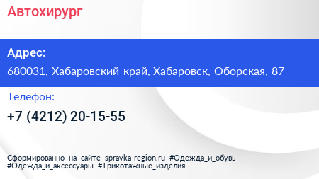Автохирург по адресу 680031, Хабаровский край, Хабаровск, Оборская, 87 в дальнейшем Организация, размещена в следующих категориях: