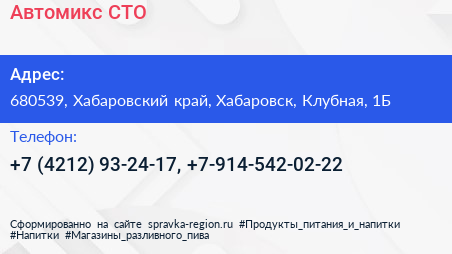 Автомикс, СТО по адресу 680539, Хабаровский край, Хабаровск, Клубная, 1Б в дальнейшем Организация, размещена в следующих категориях: