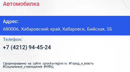 Автомобилка по адресу 680006, Хабаровский край, Хабаровск, Бийская, 1Б в дальнейшем Организация, размещена в следующих категориях: