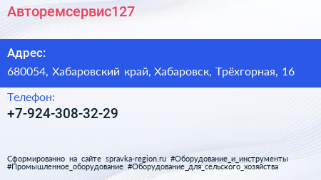 Авторемсервис127 по адресу 680054, Хабаровский край, Хабаровск, Трёхгорная, 16 в дальнейшем Организация, размещена в следующих категориях: