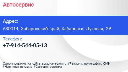 Автосервис по адресу 680014, Хабаровский край, Хабаровск, Луговая, 29 в дальнейшем Организация, размещена в следующих категориях: