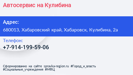 Автосервис на Кулибина по адресу 680013, Хабаровский край, Хабаровск, Кулибина, 2а в дальнейшем Организация, размещена в следующих категориях: