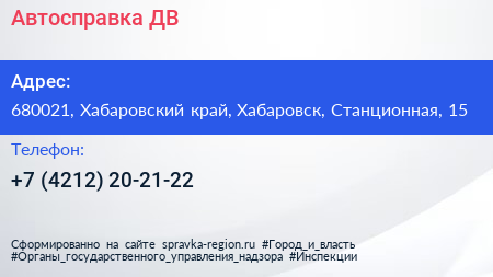 Автосправка-ДВ по адресу 680021, Хабаровский край, Хабаровск, Станционная, 15 в дальнейшем Организация, размещена в следующих категориях: