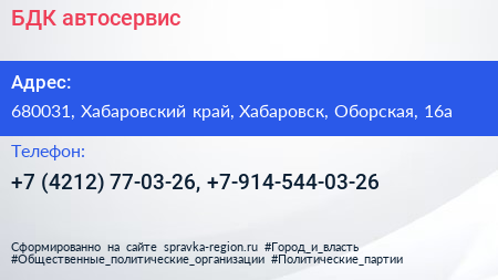 БДК, автосервис по адресу 680031, Хабаровский край, Хабаровск, Оборская, 16а в дальнейшем Организация, размещена в следующих категориях: