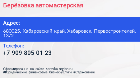 Берёзовка, автомастерская по адресу 680025, Хабаровский край, Хабаровск, Первостроителей, 13/2 в дальнейшем Организация, размещена в следующих категориях: