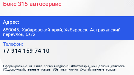 Бокс-315, автосервис по адресу 680045, Хабаровский край, Хабаровск, Астраханский переулок, 6в/2 в дальнейшем Организация, размещена в следующих категориях: