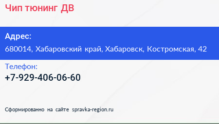 Чип-тюнинг ДВ по адресу 680014, Хабаровский край, Хабаровск, Костромская, 42 в дальнейшем Организация, размещена в следующих категориях: