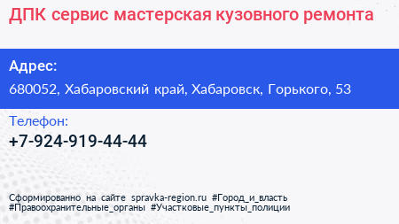 ДПК-сервис, мастерская кузовного ремонта по адресу 680052, Хабаровский край, Хабаровск, Горького, 53 в дальнейшем Организация, размещена в следующих категориях: