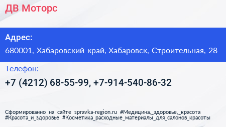 ДВ Моторс по адресу 680001, Хабаровский край, Хабаровск, Строительная, 28 в дальнейшем Организация, размещена в следующих категориях: