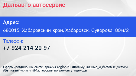Дальавто, автосервис по адресу 680015, Хабаровский край, Хабаровск, Суворова, 80м/2 в дальнейшем Организация, размещена в следующих категориях: