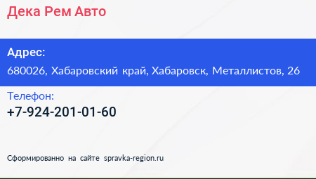 Дека Рем-Авто по адресу 680026, Хабаровский край, Хабаровск, Металлистов, 26 в дальнейшем Организация, размещена в следующих категориях: