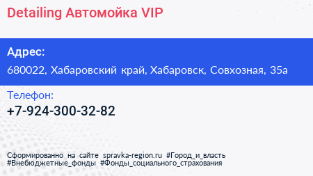 Detailing Автомойка VIP по адресу 680022, Хабаровский край, Хабаровск, Совхозная, 35а в дальнейшем Организация, размещена в следующих категориях: