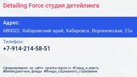 Detailing Force, студия детейлинга по адресу 680022, Хабаровский край, Хабаровск, Воронежская, 15а в дальнейшем Организация, размещена в следующих категориях: