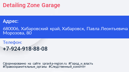 Detailing Zone Garage по адресу 680006, Хабаровский край, Хабаровск, Павла Леонтьевича Морозова, 80 в дальнейшем Организация, размещена в следующих категориях: