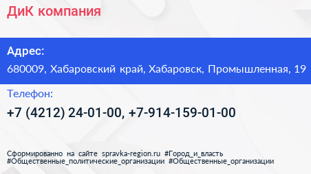ДиК, компания по адресу 680009, Хабаровский край, Хабаровск, Промышленная, 19 в дальнейшем Организация, размещена в следующих категориях: