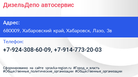ДизельДепо, автосервис по адресу 680009, Хабаровский край, Хабаровск, Лазо, 3в в дальнейшем Организация, размещена в следующих категориях:
