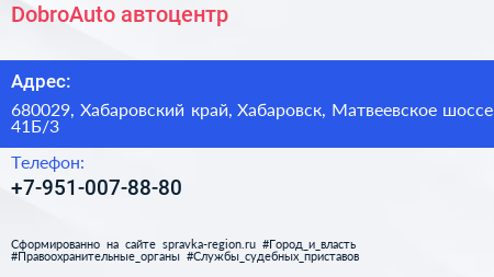 DobroAuto, автоцентр по адресу 680029, Хабаровский край, Хабаровск, Матвеевское шоссе, 41Б/3 в дальнейшем Организация, размещена в следующих категориях: