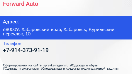 Forward Auto по адресу 680009, Хабаровский край, Хабаровск, Курильский переулок, 10 в дальнейшем Организация, размещена в следующих категориях: