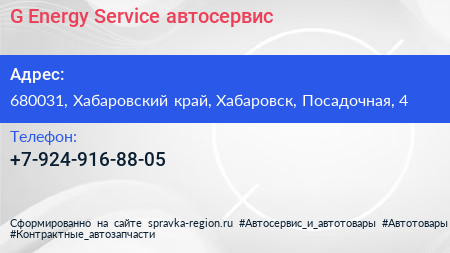 G-Energy Service, автосервис по адресу 680031, Хабаровский край, Хабаровск, Посадочная, 4 в дальнейшем Организация, размещена в следующих категориях: