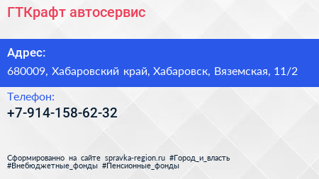 ГТКрафт, автосервис по адресу 680009, Хабаровский край, Хабаровск, Вяземская, 11/2 в дальнейшем Организация, размещена в следующих категориях: