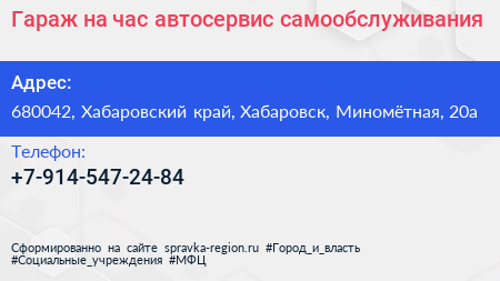 Гараж на час, автосервис самообслуживания по адресу 680042, Хабаровский край, Хабаровск, Миномётная, 20а в дальнейшем Организация, размещена в следующих категориях:
