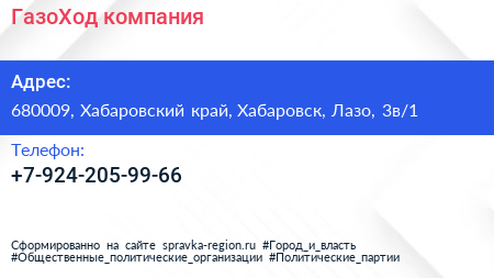 ГазоХод, компания по адресу 680009, Хабаровский край, Хабаровск, Лазо, 3в/1 в дальнейшем Организация, размещена в следующих категориях: