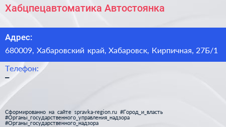 Хабцпецавтоматика, Автостоянка по адресу 680009, Хабаровский край, Хабаровск, Кирпичная, 27Б/1 в дальнейшем Организация, размещена в следующих категориях: