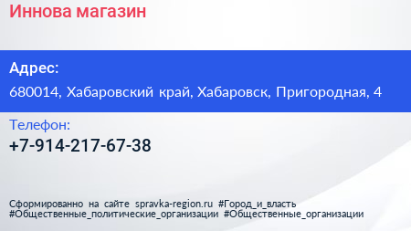 Иннова, магазин по адресу 680014, Хабаровский край, Хабаровск, Пригородная, 4 в дальнейшем Организация, размещена в следующих категориях: