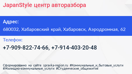 JapanStyle, центр авторазбора по адресу 680032, Хабаровский край, Хабаровск, Аэродромная, 62 в дальнейшем Организация, размещена в следующих категориях:
