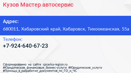 Кузов-Мастер, автосервис по адресу 680011, Хабаровский край, Хабаровск, Тихоокеанская, 55а в дальнейшем Организация, размещена в следующих категориях:
