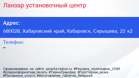 Ланзар, установочный центр по адресу 680028, Хабаровский край, Хабаровск, Серышева, 22 к2 в дальнейшем Организация, размещена в следующих категориях: