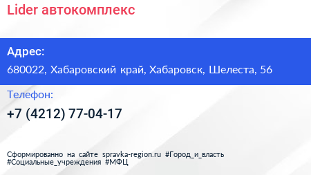 Lider, автокомплекс по адресу 680022, Хабаровский край, Хабаровск, Шелеста, 56 в дальнейшем Организация, размещена в следующих категориях: