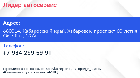 Лидер, автосервис по адресу 680014, Хабаровский край, Хабаровск, проспект 60-летия Октября, 137а в дальнейшем Организация, размещена в следующих категориях: