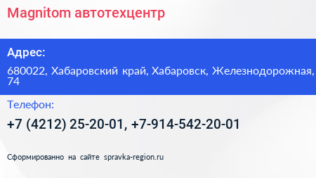 Magnitom, автотехцентр по адресу 680022, Хабаровский край, Хабаровск, Железнодорожная, 74 в дальнейшем Организация, размещена в следующих категориях: