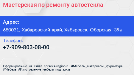 Мастерская по ремонту автостекла по адресу 680031, Хабаровский край, Хабаровск, Оборская, 39а в дальнейшем Организация, размещена в следующих категориях: