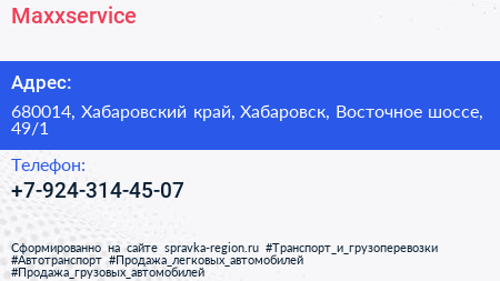 Maxxservice по адресу 680014, Хабаровский край, Хабаровск, Восточное шоссе, 49/1 в дальнейшем Организация, размещена в следующих категориях: