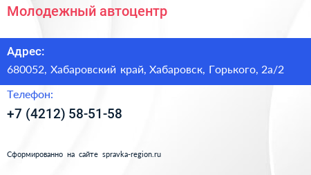 Молодежный, автоцентр по адресу 680052, Хабаровский край, Хабаровск, Горького, 2а/2 в дальнейшем Организация, размещена в следующих категориях: